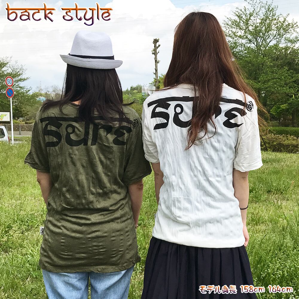 ガネーシャプリントがエスニック!落ち着いたカラーで着まわしやすいSUREクリンクル加工半袖Tシャツです。