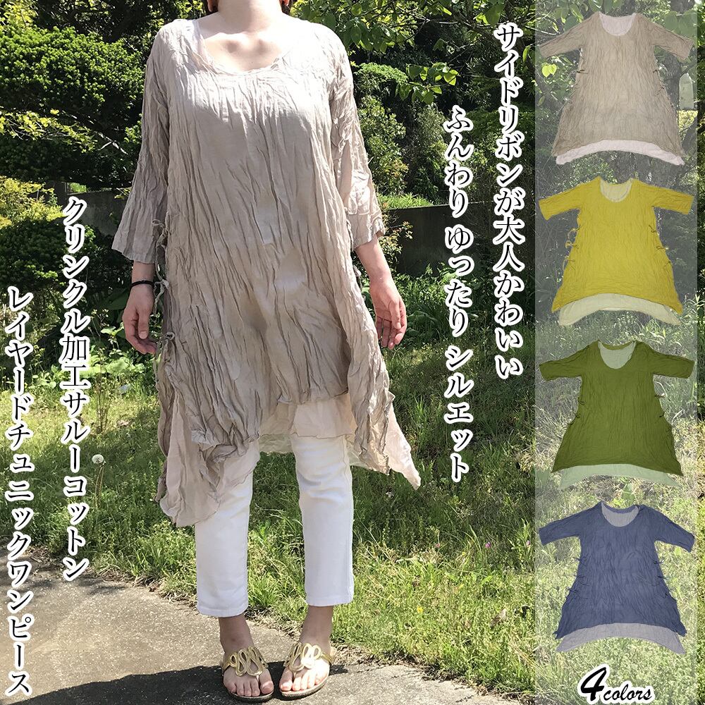サイドリボンが大人かわいい ふんわり ゆったり シルエット サルーコットン クリンクル加工 レイヤード風 ワンピース ナチュラル エスニック アジアン 七分袖 ゆうパケット シンプル 無地 op-132 | アジアン・エスニック ramah